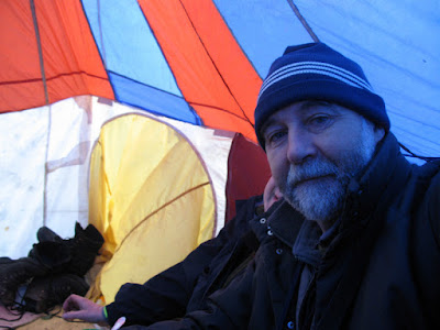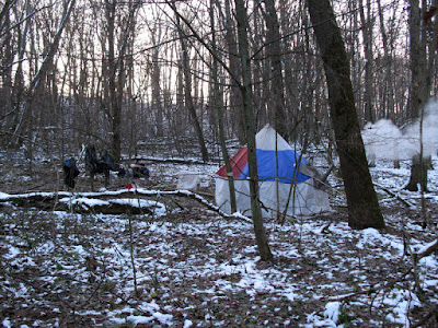Ночевали "по-полярному": осваивали палатку с печкой, которую соорудил наш корифей Виктор Васильевич специально для таких походов и для рыбалки в межсезонье. Материал - списанный парашют и куски капроновой ткани, которые нашлись в его туристическом хозяйстве. Все остальное - как в обычной палатке типа "зима", но только небольшого диаметра. Печка - в комплекте.