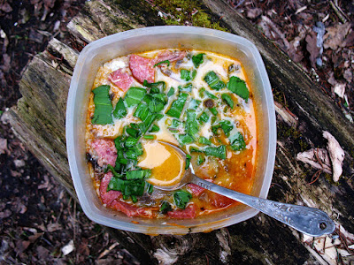 Ну как весной в лесу, и без черемши. Не в браконьерских объемах, конечно, а для придания пикантности туристической снеди и скромной компенсации к весеннему авитаминозу. Правда на этот раз найти в прибрежном лесу молодые ростки "медвежьего лука" удалось только опытному следопыту Сергею Сухареву, да и то в очень ограниченном количестве.