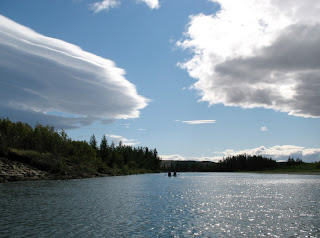 Вышли как обычно после 10-00. Характер реки постепенно меняется на равнинный. Все чаще галечное дно меняется песчаным, да и течение стало более спокойным. Миновав несколько поворотов Большая Хадата впадает в более широкую реку Щучья (по-ненецки Пыряяха). Вода в ней намного мутнее, чем в Хадате. Да еще «помогает» сильный ветер, выдувающий в воду песок с песчаных береговых откосов. Сами эти откосы на вид имеют ступенчатый характер, отражающий уровень воды в разные периоды. Эти пологие береговые склоны довольно интересны для пейзажного фотографа, а нерукотворные орнаменты обнажившегося после ухода воды дна можно рассматривать как произведение искусства, созданное самой природой. Противоположные берега в таких местах обрывистые и постоянно «подрабатываются» водой по время половодий.