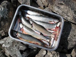 Я встал как обычно рано, искупался в ледяной воде и снова нырнул в спальник отогреваться. В начале девятого проснулись дежурные и начали шуршать возле костра. Чуть позже собрали «сетевую» команду и отправились на проверку сетей. У Иванова сетка с крупной ячеей как всегда пуста. А вот сеть Головачева принесла штук 8 гольцов разного размера, двух хариусов и небольшого налима. Рыба к столу получилась просто отменной. Часть ее закоптили в фольге со специями и овощной фаршировкой. Еще несколько штук поджарили на сетке.